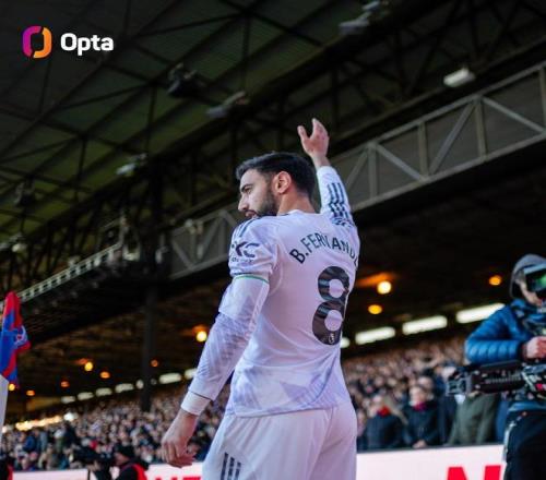 布鲁诺-费尔南德斯的5次助攻在最近4个英超客场取得,曼联先后战胜利物浦,战平诺丁汉森林、热刺,逆转水晶宫。