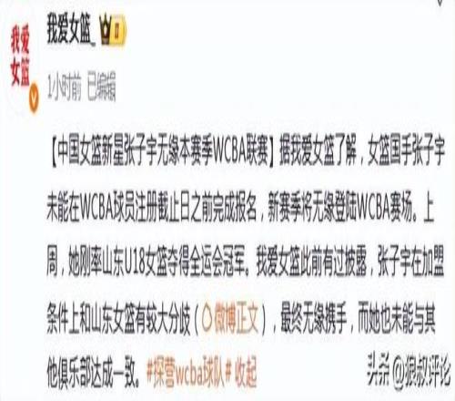 此前媒体人“我爱女篮”的报道,女篮国手张子宇未能在WCBA球员注册截止日之前完成报名,新赛季将无缘登陆WCBA赛场。