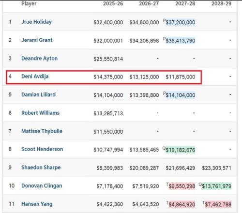 阿夫迪亚如今还是联盟物美价廉的代表之一,他的合同还剩3年——2025-26赛季年薪1438万美元,2026-27赛季1313万美元,2027-28赛季1188万美元。当今联盟全明星级别球员的年薪大都是3000万美元以上。