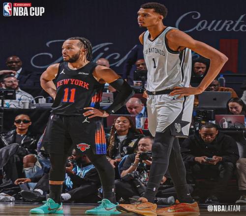 最后1分钟,尼克斯领先8分。马刺大势已去,全场结束,尼克斯124-113战胜马刺,夺得第三届NBA杯冠军。阿努诺比28分9板3助、布伦森25分4板8助2帽、唐斯16分11板、克拉克森15分。哈珀21分7板、文班亚马18分6板2帽。