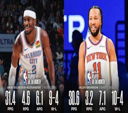 摊开数据,亚历山大12月场均31.4分4.6篮板6.1助攻,出色表现下,雷霆打出9胜4负,依旧是稳定运转的卫冕机器。而布伦森也同样不差,场均30.6分7.1助攻,带队尼克斯10胜4负。