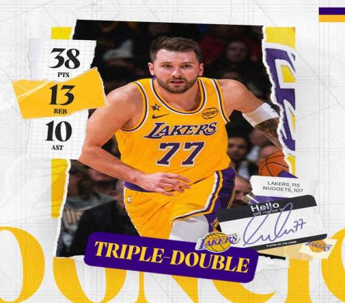 湖人队的东契奇得到38分、13个篮板和10次助攻,勒布朗得到19分、9个篮板和8次助攻,斯马特得到15分,海耶斯得到9分和5个篮板,八村塁得到9分和6个篮板。掘金队的穆雷得到28分和11次助攻,沃特森得到18分和5个篮板,戈登得到18分、4个篮板和5次助攻,琼斯得到16分和5个篮板,哈达威得到10分。