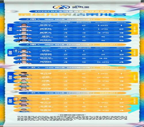 北京时间1月26日,CBA官方公布2026年全明星赛首发阵容,徐杰以1,654,042票当选南区票王,并且连续两年蝉联总票王成为历史第4人,南区首发5人分别是贺希宁、胡金秋、郭昊文、徐杰、庞峥麟;赵睿以1,280,443票当选北区票王,北区首发5人分别是曾凡博、齐麟、付豪、赵睿、廖三宁。