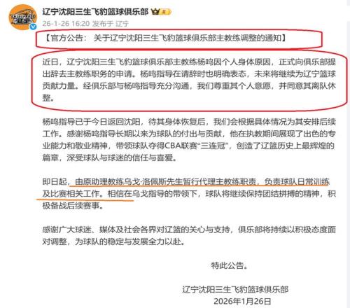 辽宁队正式宣布:杨鸣返回沈阳,身体不适辞职,助理教练乌戈·洛佩斯,代理辽宁队主教练之职!